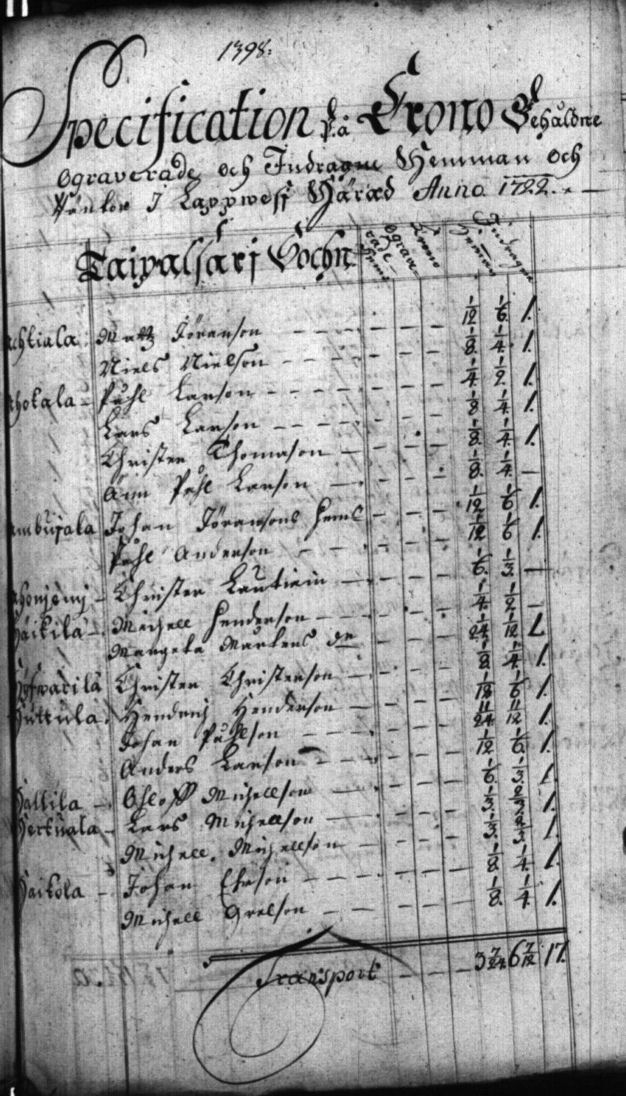 Specification på Krono Behåldne Ograverade och Indragne Hemman och Räntor I Lappwesi Härad Anno 1722. Rasituksettomien ja sisäänvedettyjen kruununtilojen ja verojen erittely Lappeen kihlakunnassa Armon vuonna 1722.