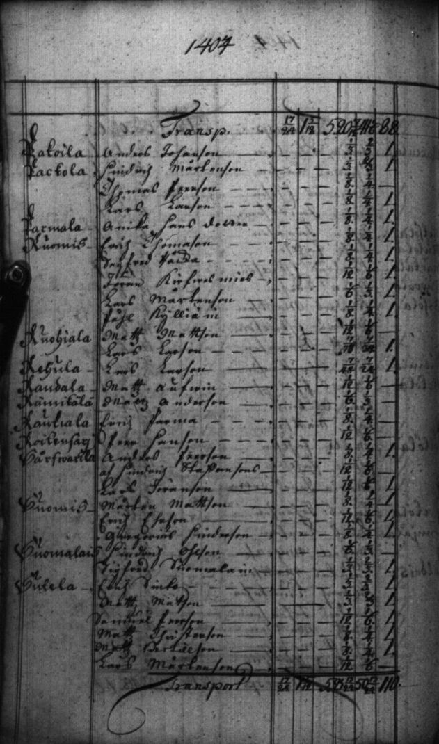 Sivulla 1404 vasen on merkittynä kylä Sårfwarila ja sen vieressä nimi Anders Peerson = Antti Pekanpoika.