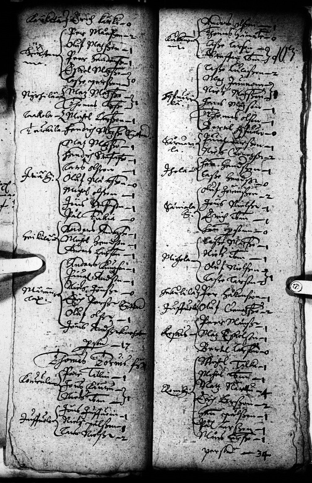 Luettelossa oikealla on kylän nimi Sårwarila ja sen vieressä nimet Påuel Larsson (Paavali Laurinpoika Räipiö) 1 ja sen alla Niels Clemetzson (Niilo Lemetinpoika Okko) 2.