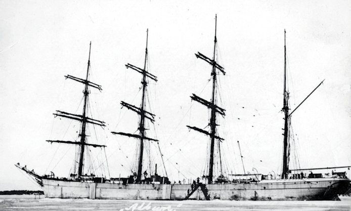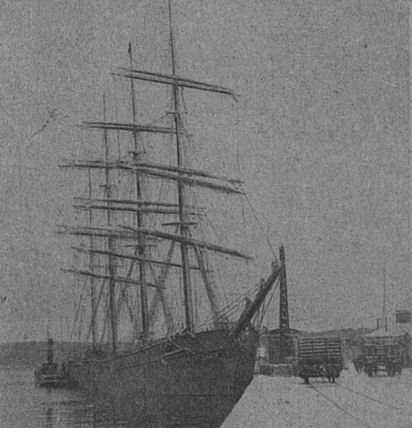 Laiva Uudenkaupungin sataman edustalla 1919/1920, josta se otti puutavaralastin Antwerpeniin. Uudenkaupungin museo.