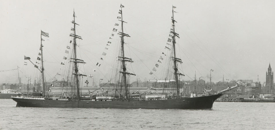 California juhlaliputettuna ankkurissa Mersey-joella Liverpoolissa. A.D. Edwardes Collection. State Library of South Australia.