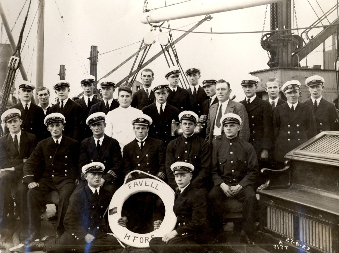 Valokuva on otettu 27.8.1929 Antwerpenissa. Päällikkö Sten Lille on kuvassa keskellä. © Merikapteeni Hannu Vartiainen.