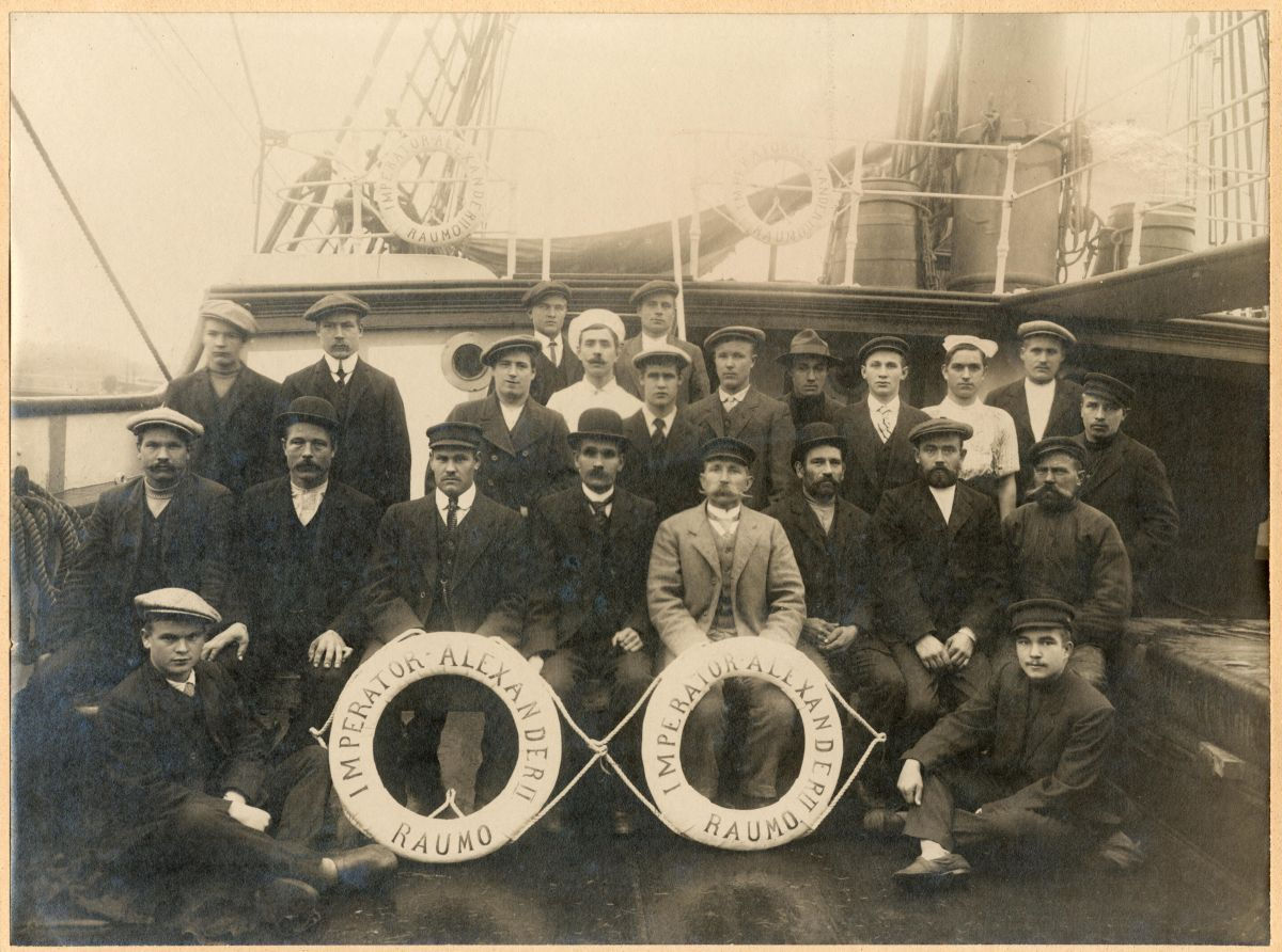 Päällikkö E.J. Rosvall istuu keskellä pelastusrenkaiden välissä.© Merikapteeni Hannu Vartiainen.