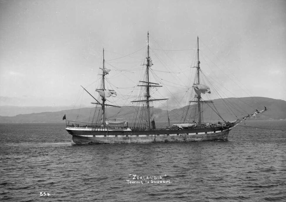 Zealandia hinauksessa matkalla Dunediin. Laivan takana näkyy toisen hinaajan savupiippu. De Maus Collection, Alexander Turnbull Library. National Library of New Zealand.