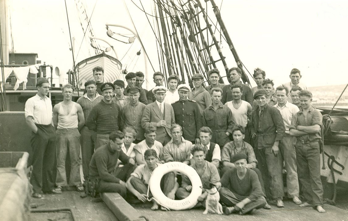 Parman päällystö ja miehistö 1934 - 1935. Keskellä päällikkö Karl Karlsson solmiossa ja valkoisessa lakissa. Kuva on otettu Port Lincolnissa 1935. © Merikapteeni Hannu Vartiainen.