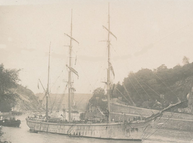 Parkkilaiva Rhea hinauksessa Avon-joella matkalla puutavaralastissa Vaasasta Bristoliin vuonna 1905. © Merikapteeni Hannu Vartiainen.