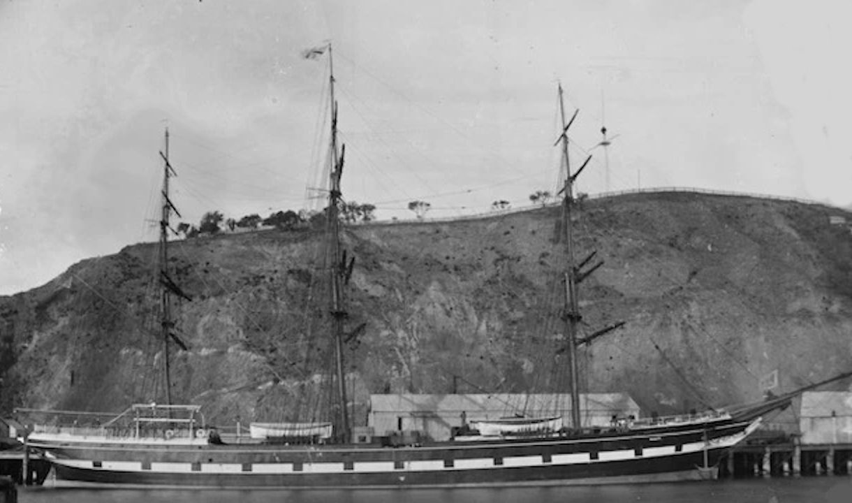 Fregatti Port Chalmersin satamassa. De Maus Collection, Alexander Turnbull Library. National Library of New Zealand.