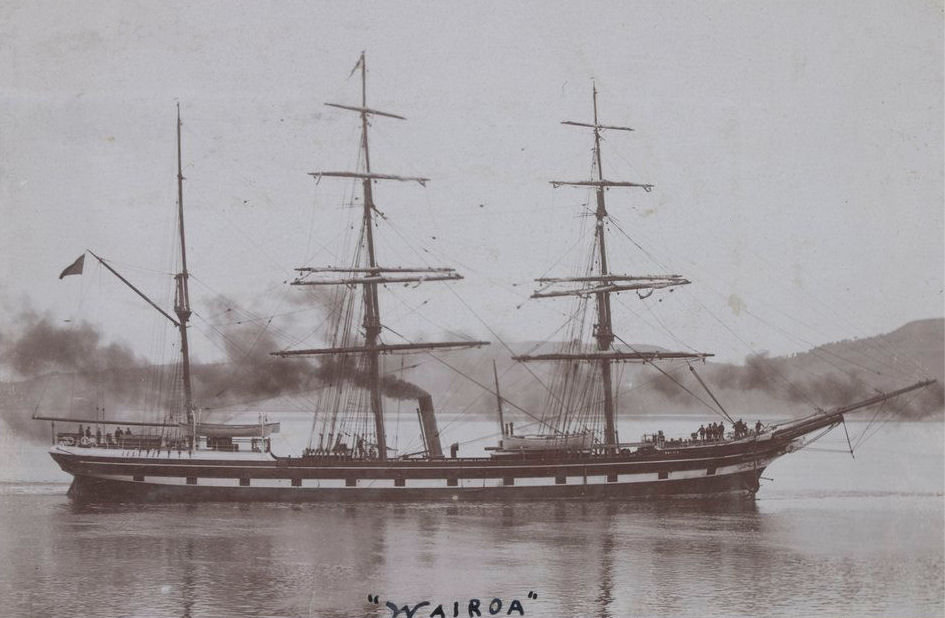 Rautaparkki hinauksessa matkalla Port Chalmersiin. Laivan takana näkyy toisen hinaajan savupiippu ja masto. De Maus Collection, Alexander Turnbull Library. National Library of New Zealand.